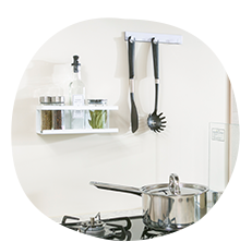 日常の「あったらいいな」を実現する住宅設備機器を提案。 キッチンではスペースを最大限に活用するために、マグネットが付くホーローパネルや、掃除が楽なガラストップのコンロを提案。洗面所にはヘルスメーター収納と、扉裏にゴミ袋を掛けるフックも設置しました。